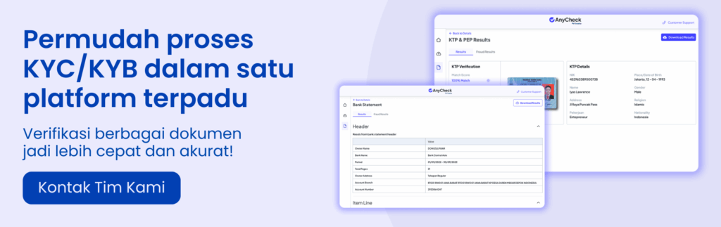 AnyCheck menggabungkan verifikasi KTP dan face matching dalam satu platform terintegrasi. Didukung teknologi OCR (Optical Character Recognition), AnyCheck mampu mengekstrak data pada KTP secara otomatis dan akurat, sehingga proses validasi informasi menjadi lebih cepat. Melalui pencocokan wajah dan validasi data diri secara menyeluruh, platform ini membantu memastikan kepemilikan identitas yang sah dalam satu alur verifikasi. Untuk informasi lebih lanjut tentang solusi AnyCheck, hubungi tim kami untuk mengetahui bagaimana platform ini dapat mendukung keamanan dan keandalan proses verifikasi identitas di perusahaan Anda.